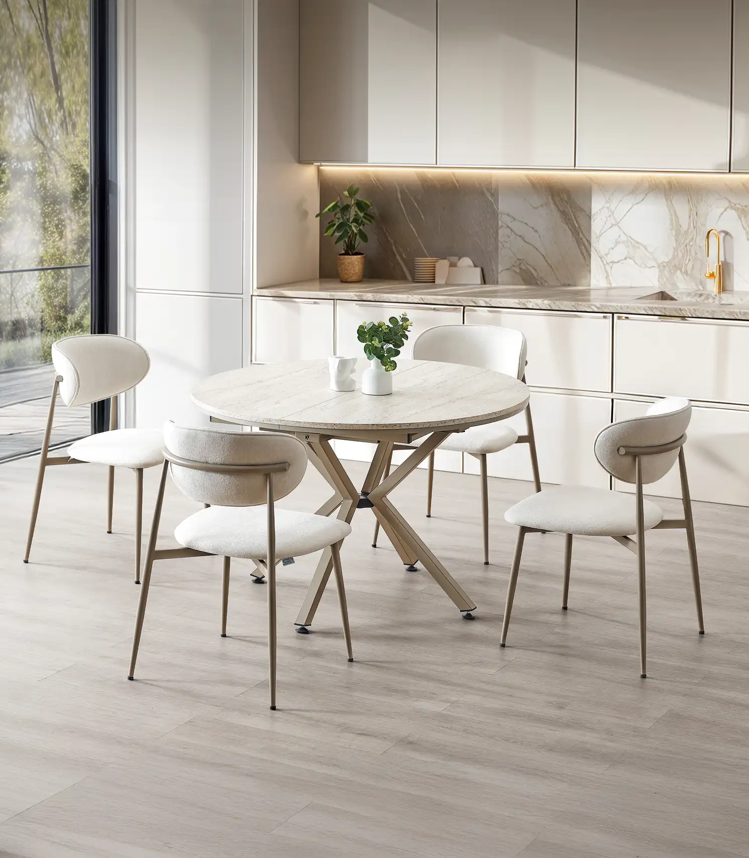 Setul este format dintr-o masă Zenitplus Traverten și cappuccino și 4 scaune Laila cappuccino.
