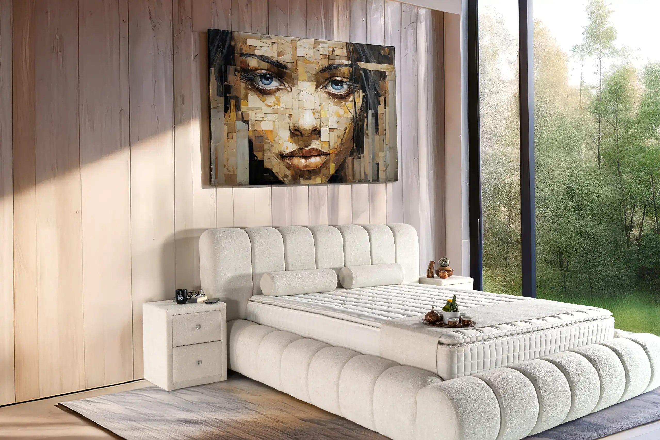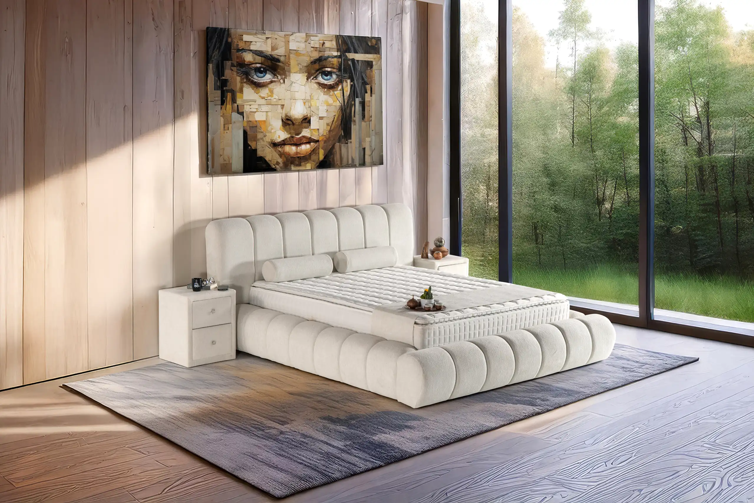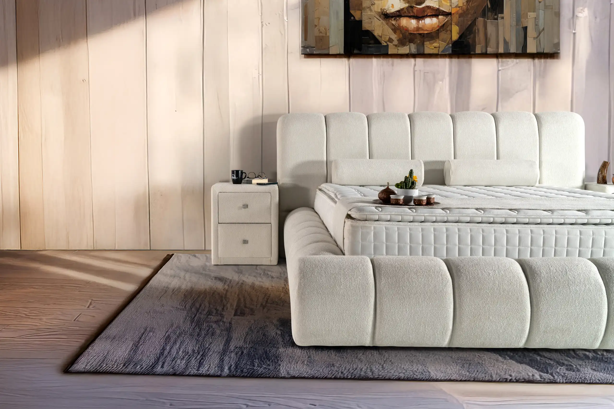 Pat tapitat Avanos se remarcă printr-o tapițerie luxoasă, realizată dintr-un material textil premium, de culoare deschisă, care se integrează armonios în diverse stiluri de amenajare interioară. Cadrul său robust este îmbrăcat într-un material pufos, oferind atât un aspect vizual plăcut, cât și o senzație de confort maxim. Tablia capitonată cu linii verticale accentuează eleganța patului, adăugând o notă de rafinament și stil.