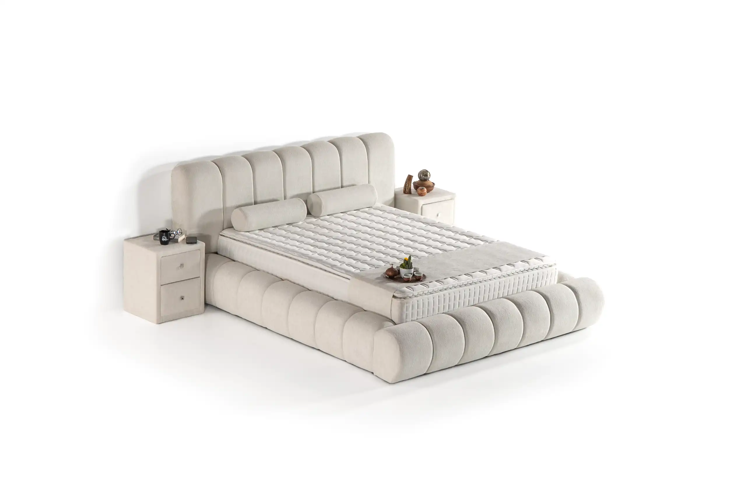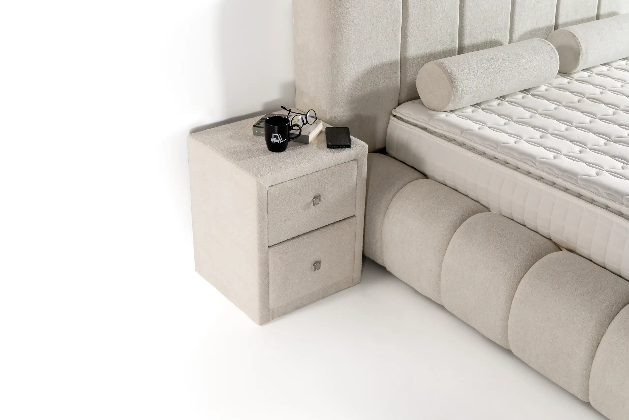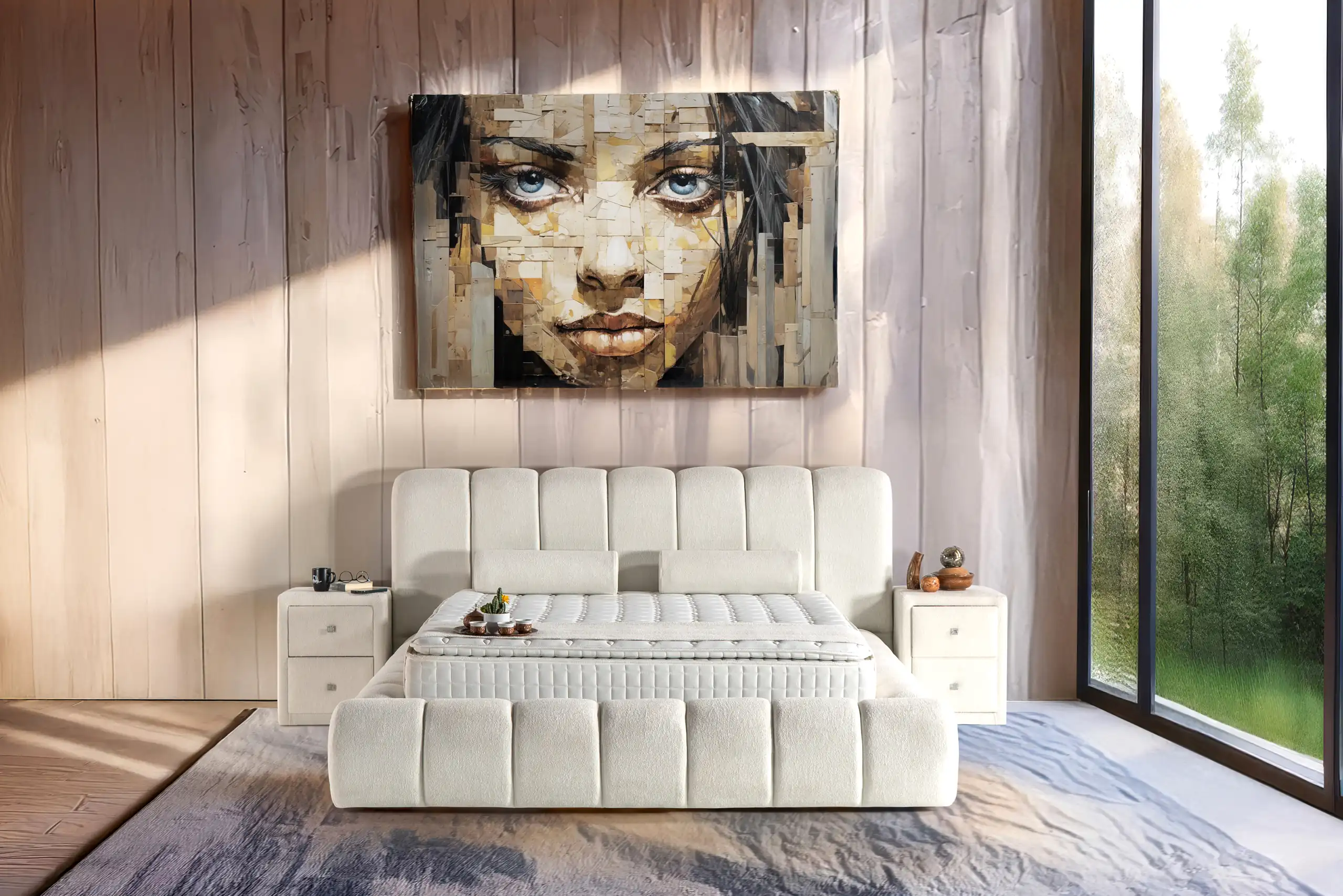 Pat tapitat Avanos se remarcă printr-o tapițerie luxoasă, realizată dintr-un material textil premium, de culoare deschisă, care se integrează armonios în diverse stiluri de amenajare interioară. Cadrul său robust este îmbrăcat într-un material pufos, oferind atât un aspect vizual plăcut, cât și o senzație de confort maxim. Tablia capitonată cu linii verticale accentuează eleganța patului, adăugând o notă de rafinament și stil.