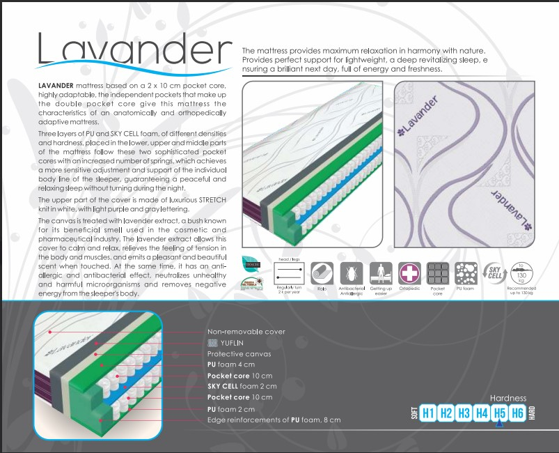 Salteaua LAVANDER are la bază un nucleu pocket de 2 x 10 cm, foarte adaptabil, buzunarele independente care alcătuiesc nucleul pocket dublu conferă acestei saltele caracteristicile unei saltele adaptabile anatomic și ortopedic. Trei straturi de spumă PU și SKY CELL, de densități diferite și plasate în părțile inferioară, superioară și mijlocie ale saltelei, urmează acești doi nuclee pocket sofisticați cu un număr crescut de arcuri, realizând o ajustare și susținere mai sensibilă a liniei individuale a corpului celui care doarme, garantând un somn liniștit și relaxant fără întoarceri în timpul nopții. Țesătura este tratată cu extract de lavandă, o plantă cunoscută pentru mirosul său benefic utilizat în industria cosmetică și farmaceutică. Extractul de lavandă permite acestei huse să calmeze și să relaxeze, să amelioreze senzația de tensiune în corp și mușchi, și să elibereze un miros plăcut și frumos la atingere. În același timp, are un efect antialergic și antibacterian, neutralizând microorganismele nesănătoase și dăunătoare, eliminând energia negativă din corpul celui care doarme.
