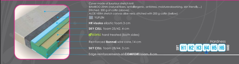 Salteaua premium, cu un nucleu consolidat de arcuri BONNELLI, se încadrează în categoria saltelelor mai ferme. În partea superioară a saltelei se află o placă de spumă HR (de înaltă reziliență) de înaltă calitate, care are proprietăți ergonomico-ortopedice accentuate, o moliciune de suprafață mai mare, își menține elasticitatea și își păstrează forma și proprietățile chiar și după ani de utilizare, garantând un climat plăcut pe tot parcursul anului. Acest model de saltea de performanță înaltă oferă un suport ortopedic excelent corpului, permite un somn de calitate și trezire mai ușoară, fiind destinat în primul rând celor care preferă materialele naturale și confortul superior. Husa este nedetașabilă, cusută atât în partea superioară (300 g coflin), cât și în partea inferioară (cu 200 g coflin). Partea superioară a husei, tratată cu fibre de BAMBOO folosind tehnologia ZENN, are proprietăți puternice antibacteriene, oferă o mai bună respirabilitate și absoarbe cel mai bine umiditatea. Contactul corpului cu acest țesătura luxoasă activează funcția de eliminare a alergenilor, prevenind apariția bacteriilor dăunătoare, ciupercilor, acarienilor și crearea unor mirosuri neplăcute, iar adăugarea fibrelor de carbon denumite INTENSE neutralizează încărcătura naturală a corpului, eliberându-l de tensiuni și oferindu-i astfel proprietăți antistres.
