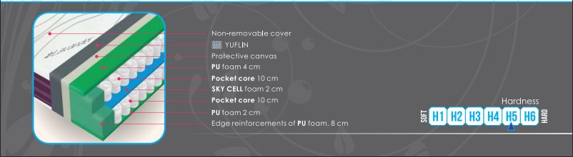Salteaua LAVANDER are la bază un nucleu pocket de 2 x 10 cm, foarte adaptabil, buzunarele independente care alcătuiesc nucleul pocket dublu conferă acestei saltele caracteristicile unei saltele adaptabile anatomic și ortopedic. Trei straturi de spumă PU și SKY CELL, de densități diferite și plasate în părțile inferioară, superioară și mijlocie ale saltelei, urmează acești doi nuclee pocket sofisticați cu un număr crescut de arcuri, realizând o ajustare și susținere mai sensibilă a liniei individuale a corpului celui care doarme, garantând un somn liniștit și relaxant fără întoarceri în timpul nopții. Țesătura este tratată cu extract de lavandă, o plantă cunoscută pentru mirosul său benefic utilizat în industria cosmetică și farmaceutică. Extractul de lavandă permite acestei huse să calmeze și să relaxeze, să amelioreze senzația de tensiune în corp și mușchi, și să elibereze un miros plăcut și frumos la atingere. În același timp, are un efect antialergic și antibacterian, neutralizând microorganismele nesănătoase și dăunătoare, eliminând energia negativă din corpul celui care doarme.