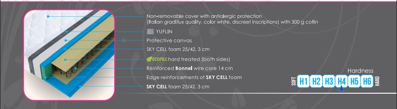 Salteaua Premier se remarcă prin confortul și durabilitatea sa, fiind ideală pentru iubitorii de somn tradițional pe arcuri. Această saltea oferă un somn confortabil și sănătos, precum și relaxare. Nucleul acestei saltele reprezintă o combinație de duritate și rezistență, menținând în același timp elasticitatea și confortul. Este potrivită pentru toate formele și greutățile corpului - corpul este susținut ergonomic și eliberat la toate punctele de presiune în timpul odihnei. Salteaua dispune de o husă înșurubată nedetașabilă, confecționată din material de calitate lux italian, tratată cu substanțe anti-alergice și antibacteriene, ceea ce o face sigură pentru dumneavoastră și mediul înconjurător. Aceasta a fost dovedită a preveni dezvoltarea bacteriilor și retenția mirosurilor în țesătură, oferind protecție împotriva acarienilor și mucegaiului, ceea ce sporește în continuare calitatea și durabilitatea saltelei.